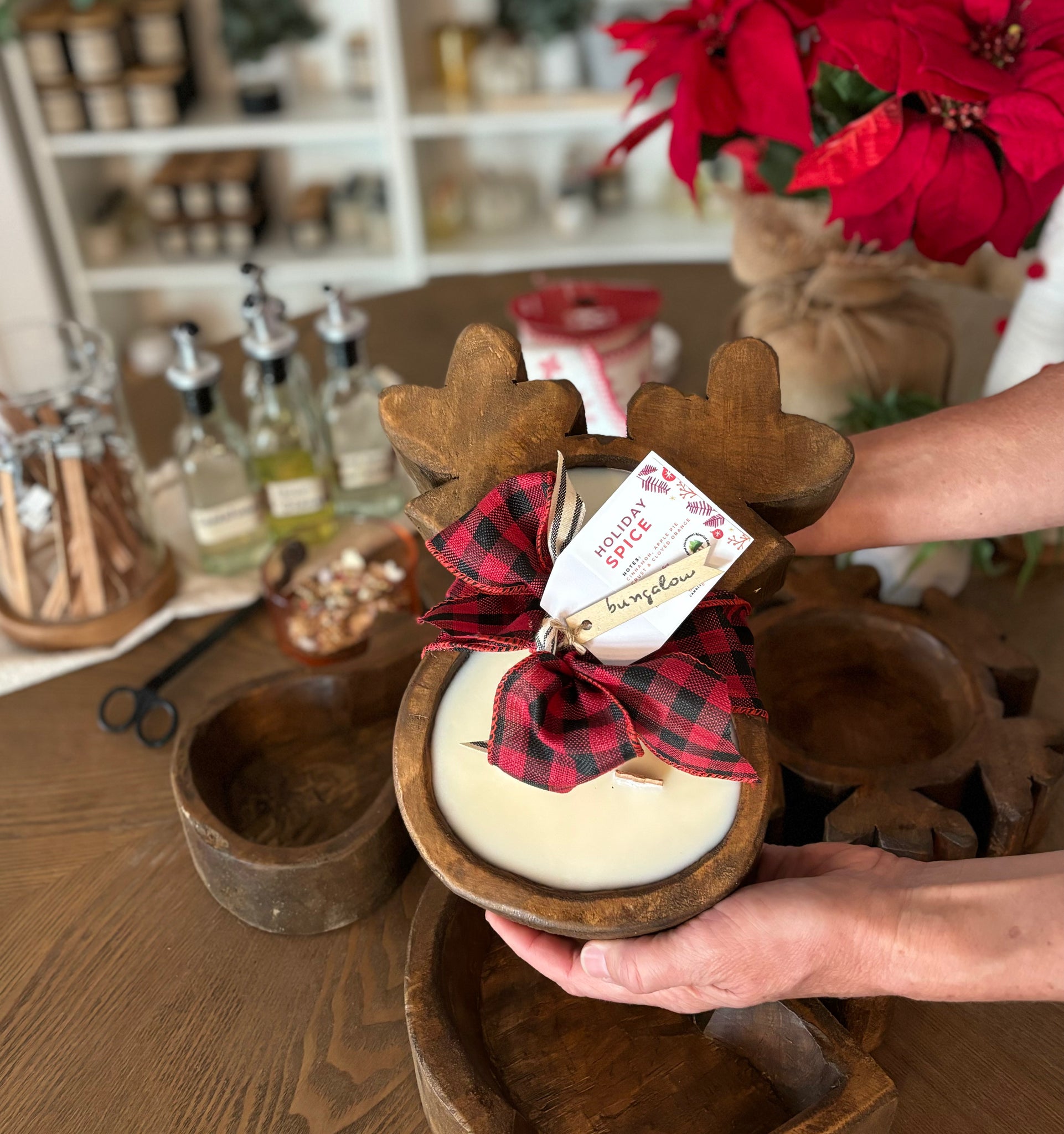 These hand-carved wood dough bowls come in 3 fun holiday shapes: snowflake, reindeer, and Santa hat!